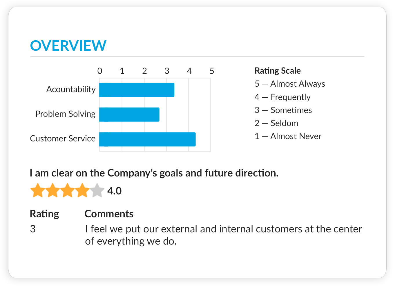 Create tailored surveys for more informed decisions. Get feedback about leaders, peers, culture, exit interviews, engagement, and more.
